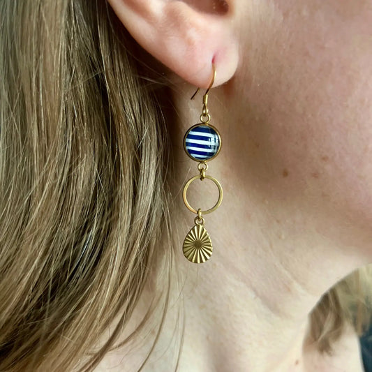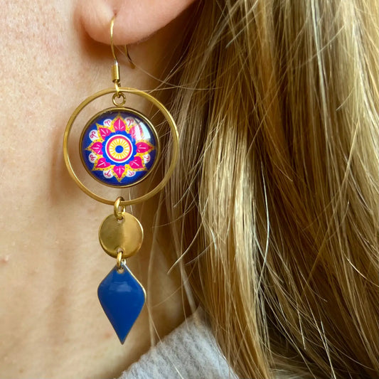 BOUCLES D'OREILLES pendantes citrons sur fond bleu, émail jaune