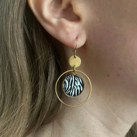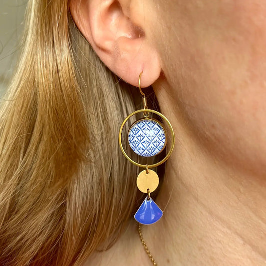 Boucles d'oreilles asymétriques motif bleu et blanc finition dorée