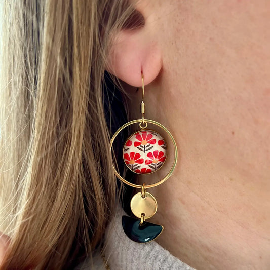 Boucles d'oreilles asymétriques motif rouge et blanc finition dorée