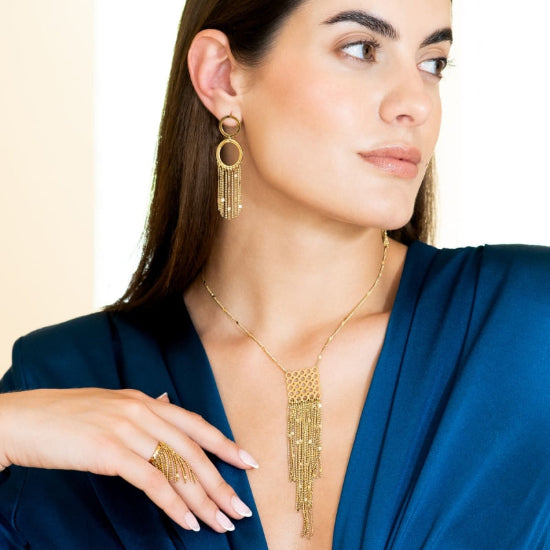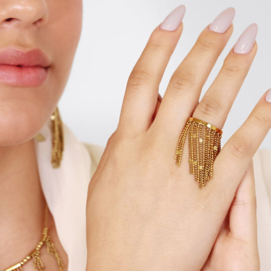 La bague Rainfall Drizzle se distingue par ses fines chaînes en acier chirurgical 316 L plaqué or 18 Carats, réputée pour sa durabilité et ses propriétés hypoallergéniques. Son design et ses chainettes plongeantes apportent une touche sophistiquée sans compromettre sa résistance.