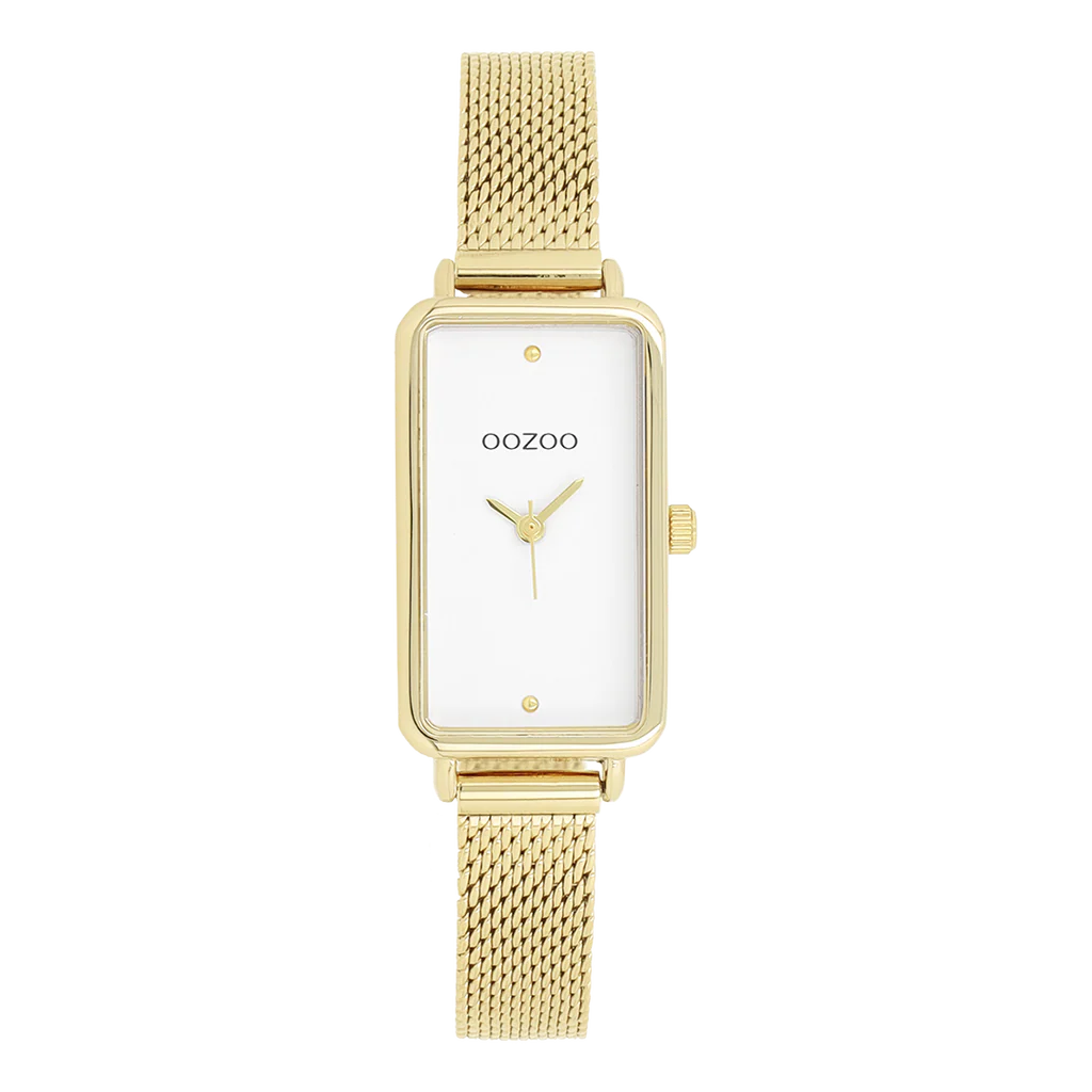 Son boîtier en métal doré (19x31 mm) sublime un cadran blanc épuré, orné d’index en pointillés dorés et d’aiguilles assorties. Le bracelet en maille métallique dorée apporte confort et brillance, faisant de cette montre un accessoire aussi chic que polyvalent.